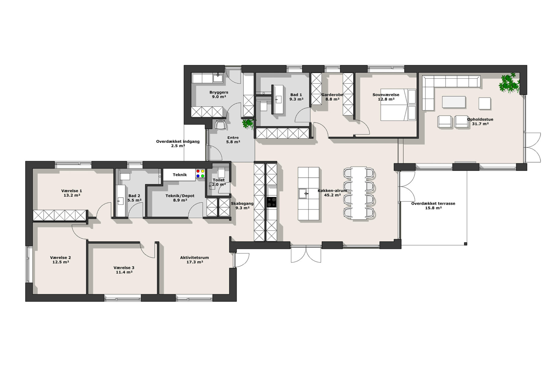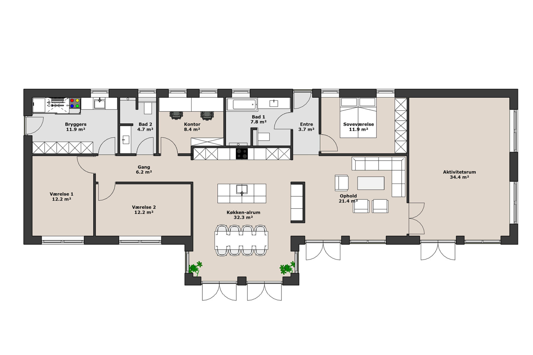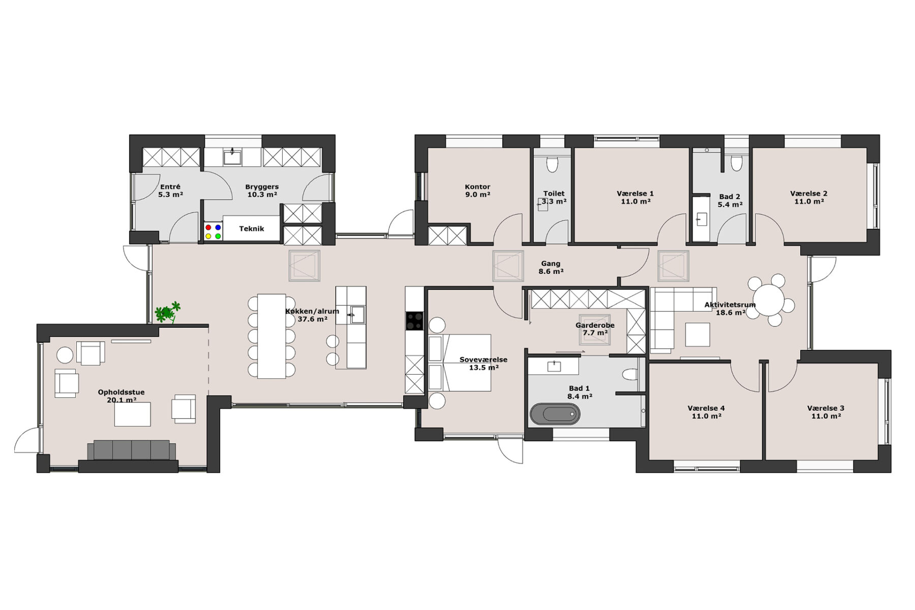 Planløsningerne kan varieres i det uendelige. Det gælder også taget og byggestilen. Længehus. Vinkelhus. Eller måske H-hus? 1-planshuset skaber en naturlig sammenhæng mellem fællesområder, private værelser og ungdomsafdeling.