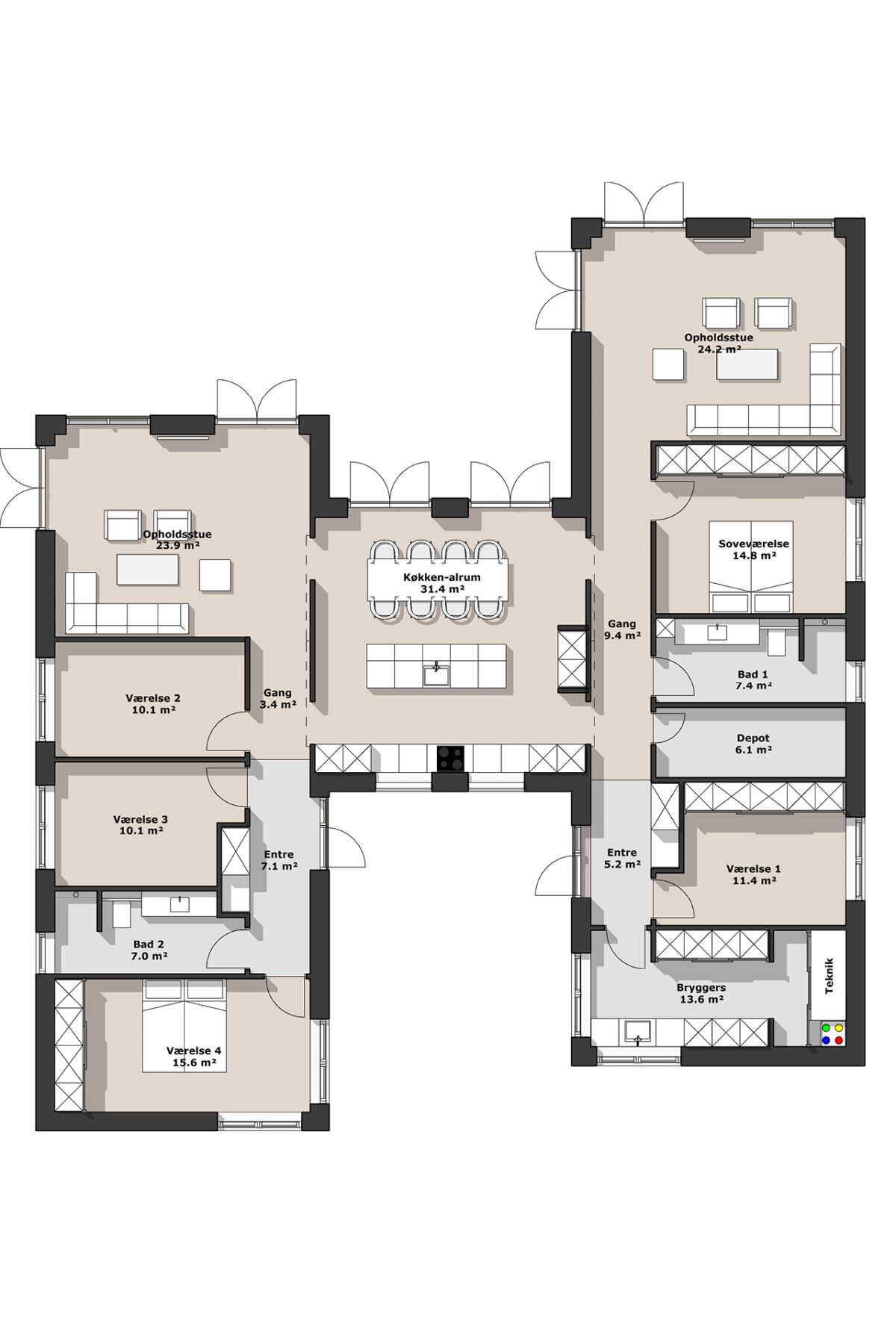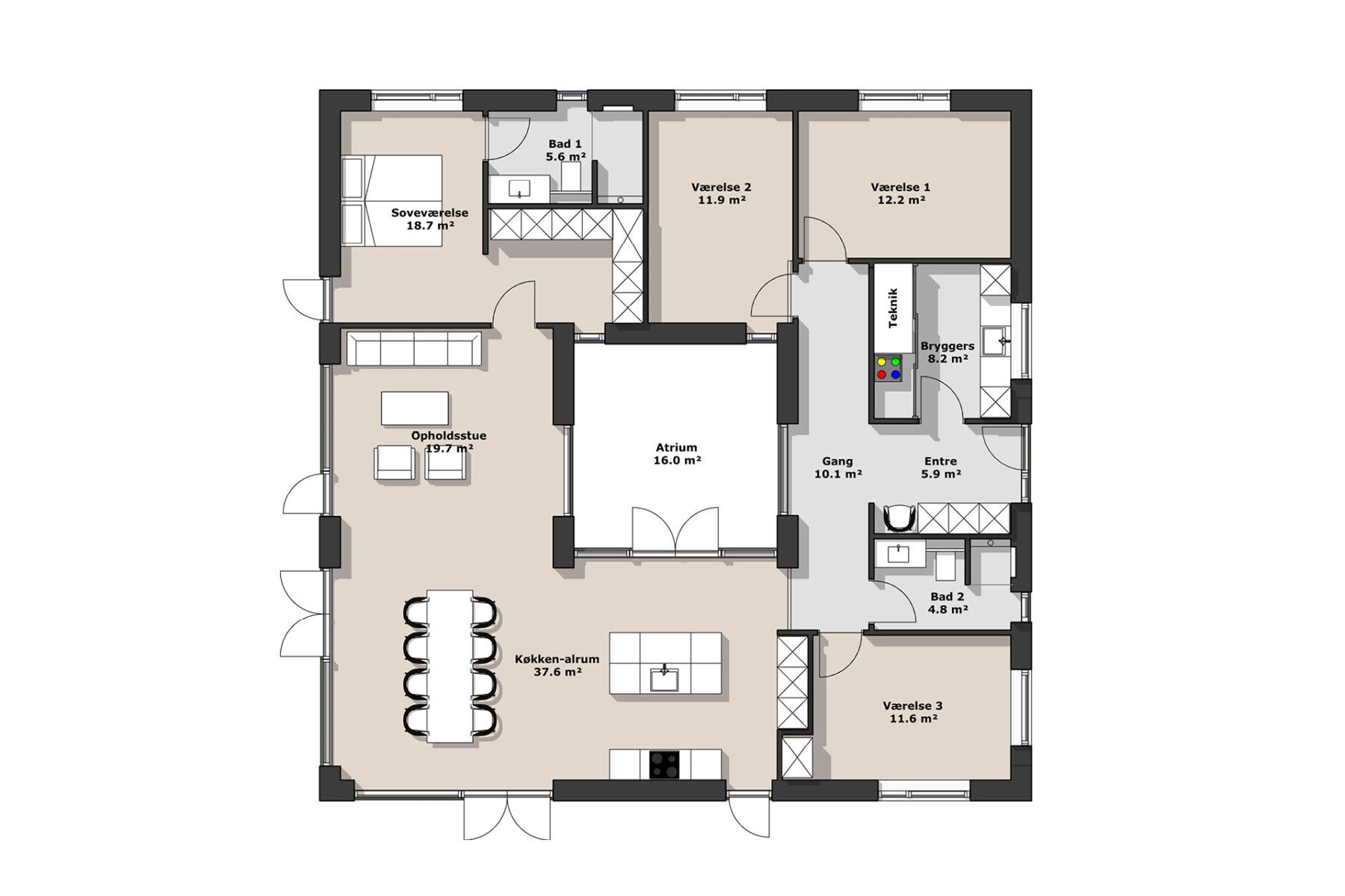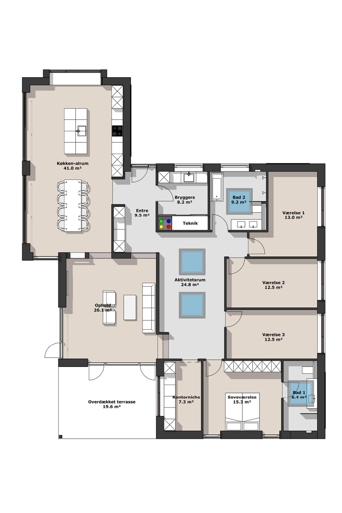 Planløsningerne kan varieres i det uendelige. Det gælder også taget og byggestilen. Længehus. Vinkelhus. Eller måske H-hus? 1-planshuset skaber en naturlig sammenhæng mellem fællesområder, private værelser og ungdomsafdeling.