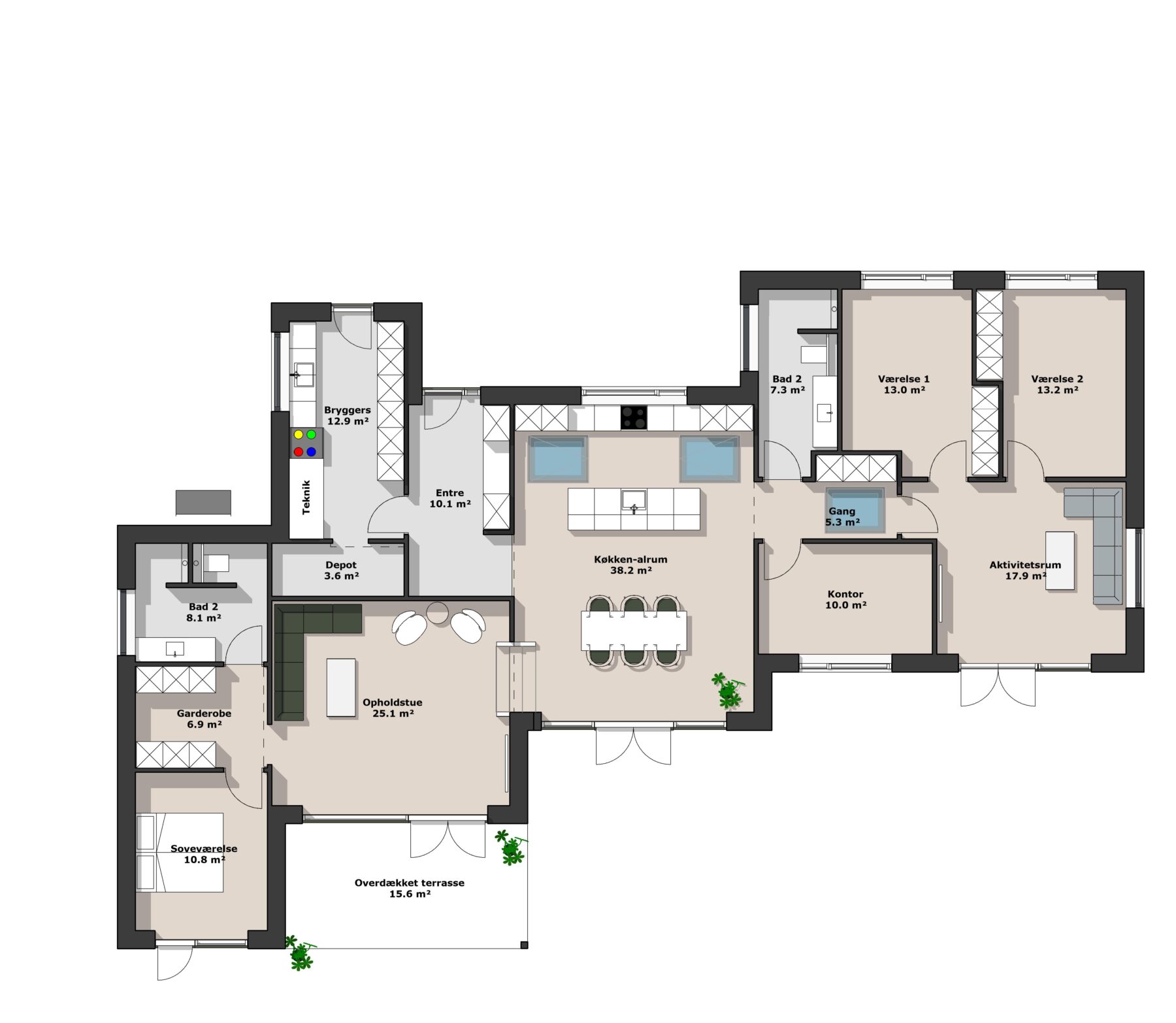 Du og familien får kæmpe fleksibilitet. I kan få vandret loft eller loft til kip? Store vinduespartier, smagfulde terrasser og hyggekroge både indendørs og udenfor.