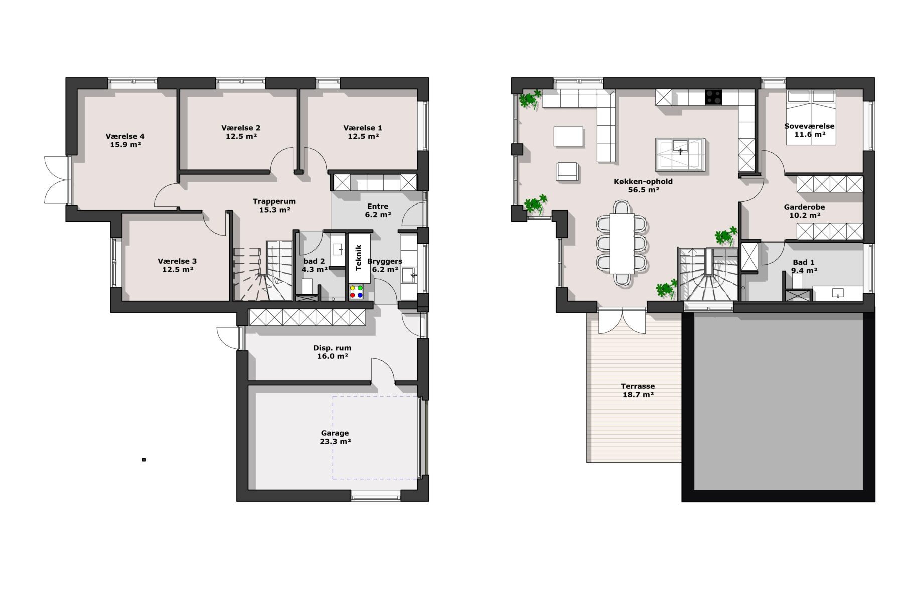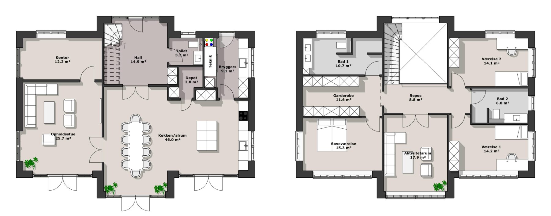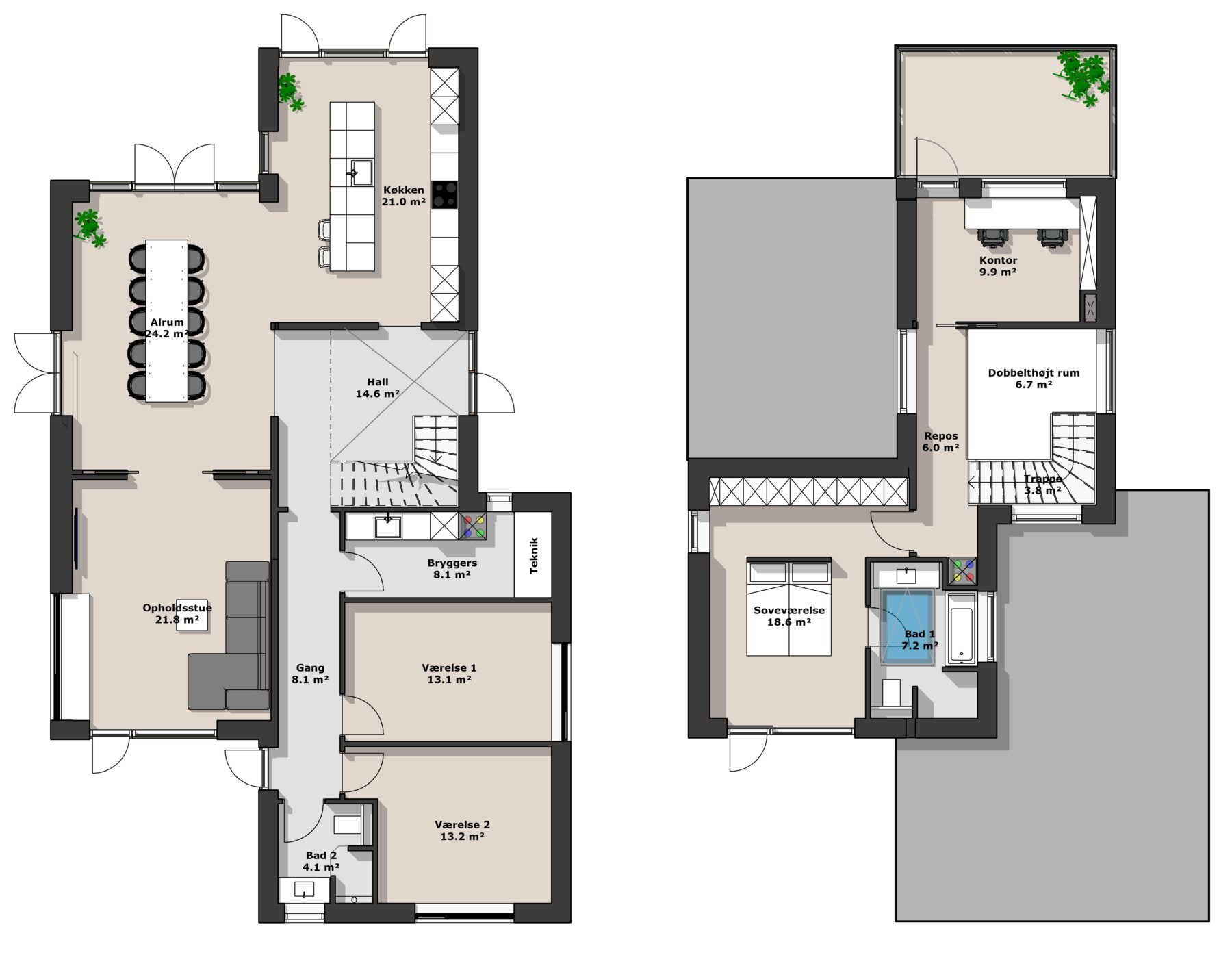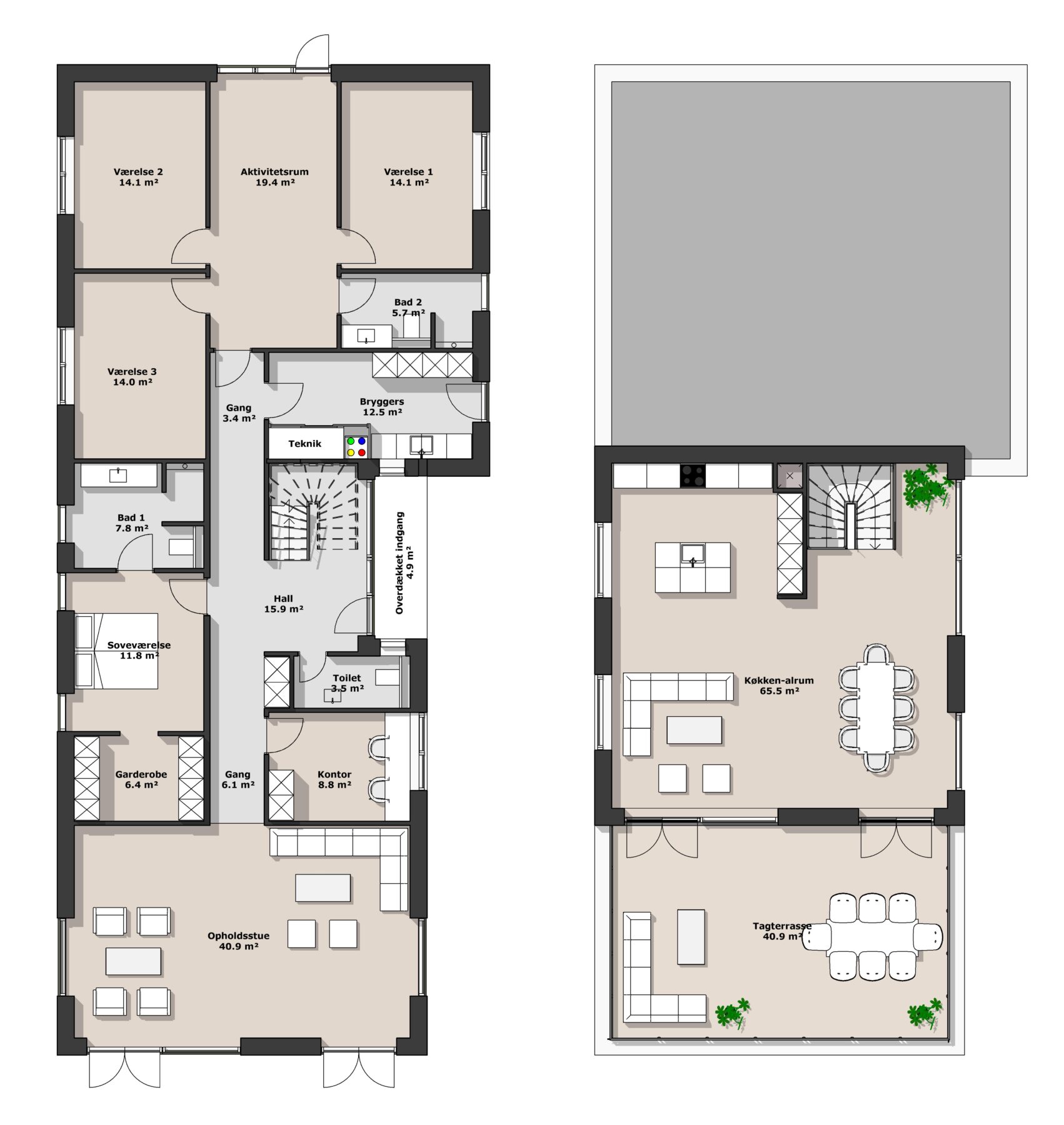 2-planshuse giver også en unik mulighed for en tagterrasse, hvor du kan skabe et helt særligt uderum og nyde udsigten. Vores 2-planshuse er ofte designet i moderne funkisstil, som er kendt for rene linjer, flade tage og en enkel, funktionel æstetik.