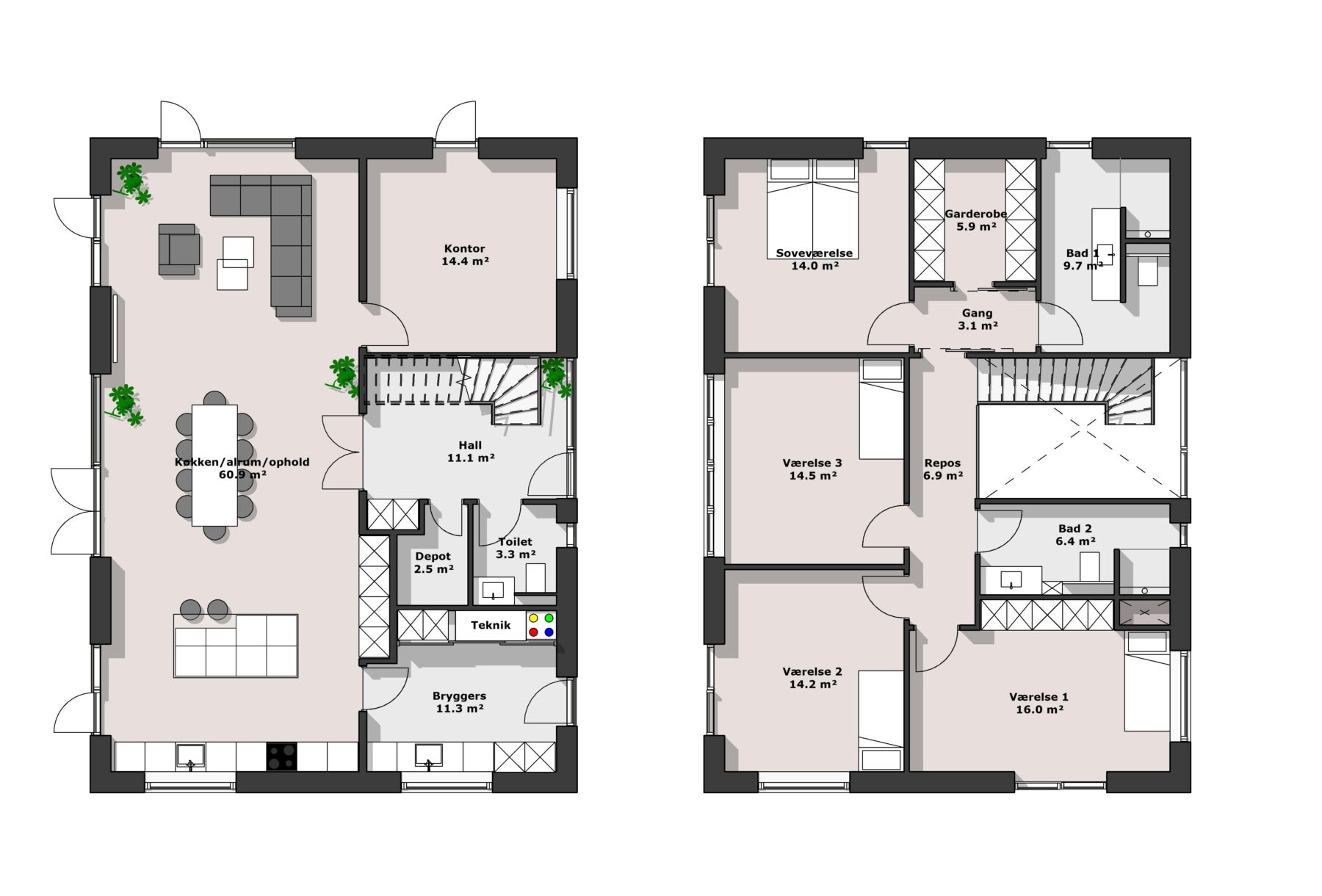 Men lige så ofte bygger vi 2-planshuse som palæer med sprossede vinduer og murede gesimser og kvader. Med plads til store vinduespartier og fokus på lys og luft skaber 2-planshuset et tidløst udtryk, der både er elegant og praktisk. Skal det være ekstraordinært? Og skal familien have masser af plads at boltre sig på? Så skal I have et 2-planshus.