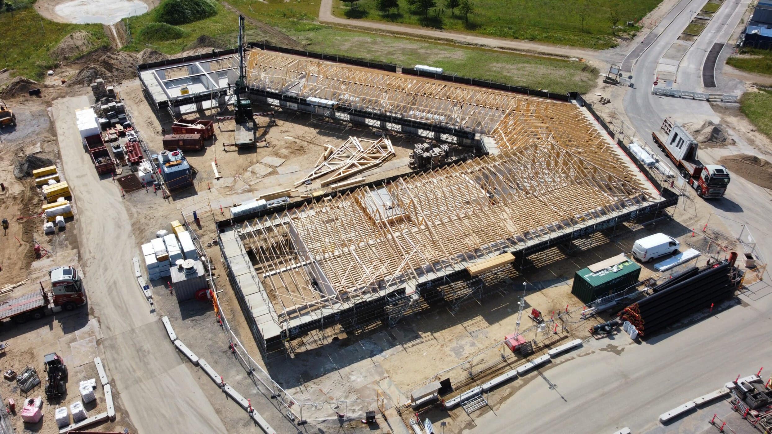Taget er en gitterspærkonstruktion med en forskudt kiplinje, som der bliver monteret tagbrædder på. Tagbeklædningen bliver afsluttet med sort tagpap, og der kommer solceller på de sydvendte tagflader.